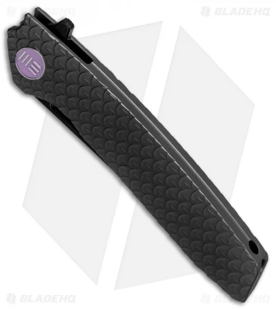 This 604 model has a black titanium handle and a two-tone finished blade. The We Knife Co. 604F offers a long elegant design with a sleek tanto blade in a two-tone finish. Black flats and satin finished grinds add to the tactical appeal of the blade. The bronze anodized titanium handle comes with a dragon scale texture that provides a utilitarian grip as well as a collectible appearance. Purple anodized hardware adds a nice finishing touch to the design.