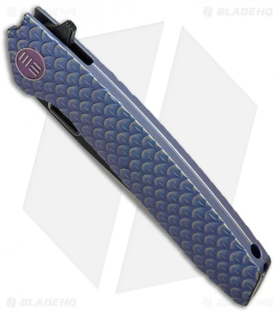 The We Knife Co. 604M offers a long elegant design with a sleek recurve blade in a two-tone finish. Black flats and satin finished grinds add to the tactical appeal of the blade. The blue anodized titanium handle comes with a scaled texture that provides a utilitarian grip as well as a collectible custom appearance. Purple anodized titanium clip and hardware finish off the stellar design.