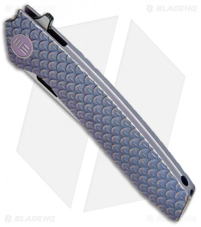 This 604 model has a blue titanium handle and a two-tone finished blade. The We Knife Co. 604S offers a long elegant design with a sleek tanto blade in a two-tone finish. Satin flats and Black finished grinds add to the tactical appeal of the blade. The bronze anodized titanium handle comes with a dragon scale texture that provides a utilitarian grip as well as a collectible appearance. Purple anodized hardware adds a nice finishing touch to the design.