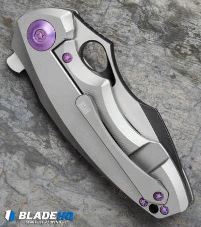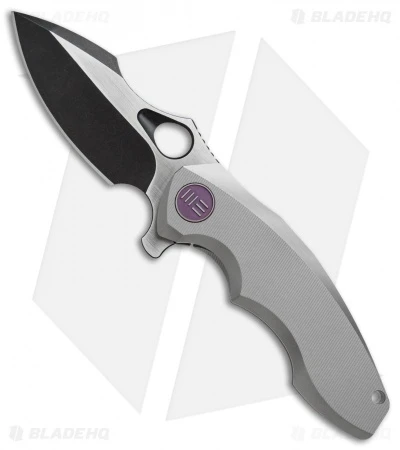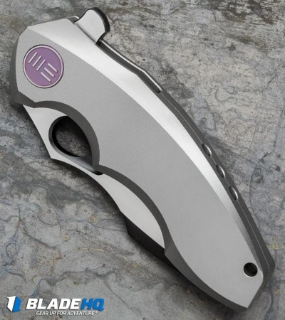 The 605E represents We Knife Co’s most compact EDC flipper to date. With a 3″ blade and a sturdy titanium handle, the 605 is built strong enough to handle any cutting chore, big or small. The frame lock handle features a reinforced lock bar and an ergonomically contoured grip. It has a modified drop point blade with a choil and thumb rest for choking up your grip for more leverage. A blade flipper and an ample thumb hole provide diverse deployment options. This 605E model has a gray titanium handle with purple anodized hardware and a two-tone finished blade.