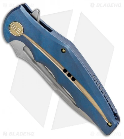 The WE Knife Co. 608Q is a reliable flipper made with premium materials and lightweight, ergonomic construction. This model has a blue titanium handle with bronzed hardware, and a stonewashed blade. Its drop point style blade features jimping on the thumb ramp and flipper for added grip and control. The 608Q boasts a ceramic ball bearing pivot for unbelievably responsive flipping action.
