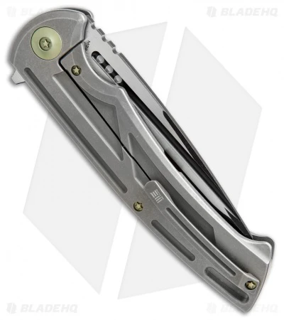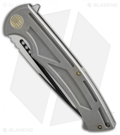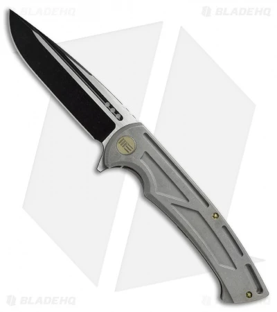 This 614E model sports a gray titanium handle and a two-tone blade with satin flats and black grinds. The We Knife Co. 614 flipper has a large modern design with dependable titanium construction. It’s equipped with a high performance Bohler M390 steel blade and a titanium frame lock handle with a titanium pocket clip and back spacer. Machined grooves in the handle provide improved grip and added style to the design.