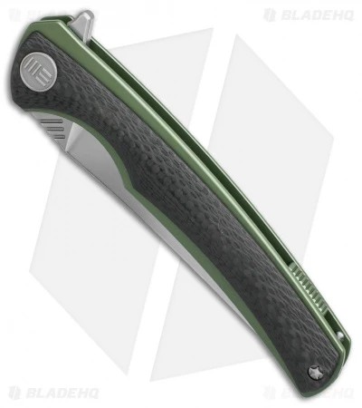 The 704CF-C folding knife from WE Knife Co. is equipped with carbon fiber scales over green anodized titanium liners. Its lightweight handle is paired with a hand rubbed satin finished Bohler M390 blade with a slight upswept tip. The addition of a ball bearing pivot offers smooth flipping action for responsive and reliable one-handed blade deployment. This pocket-friendly design comes fitted with a green anodized tip-up titanium pocket clip.