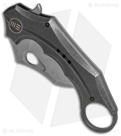 This 708D model comes equipped with a gray titanium handle and a karambit style blade with a stonewash finish. Pick up a tactical EDC companion with the long-awaited 708 Karambit folding knife from We Knife Co. The 708 is compact enough for everyday carry yet packs a serious punch in self defense situations. It has a flipper opener, assisted by a smooth ceramic ball bearing pivot for minimal deployment times. The handle is outfitted with a titanium clip for comfortable pocket carry and a finger hole for maximized blade control. Bronze anodized titanium hardware finishes off the impressive design.