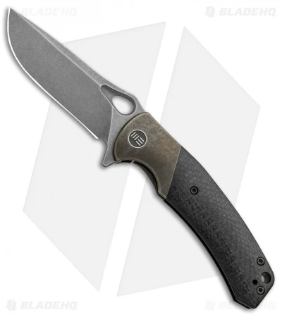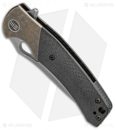 This model of the WE Knife Co. Bishop features a bronze anodized titanium handle with carbon fiber overlays and a stonewashed blade.
