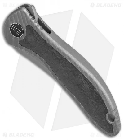 - Handle is made of 6AL4V titanium with a shredded carbon fiber inlay and a matching titanium tip-up pocket clip.
