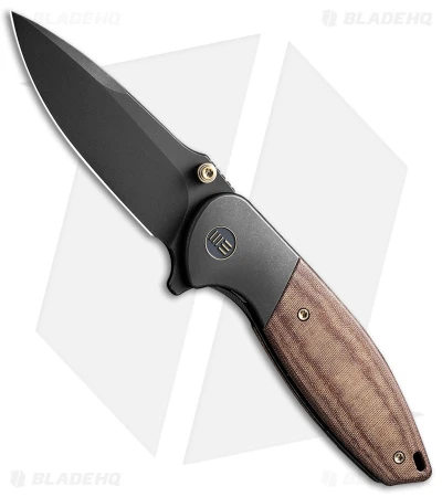 - Brown micarta scales on a titanium frame with black titanium bolsters.