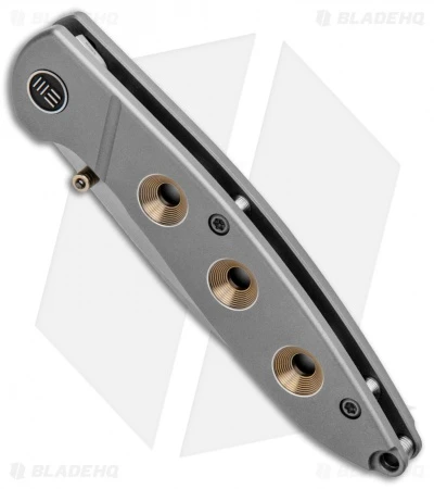 All that WE Knife goodness is on full display with this Schism folding knife. This model sports a titanium handle with gold anodized holes and a sleek wharncliffe blade with a refined stonewash finish. Dual thumb studs offer classic one-hand deployment with a titanium frame lock providing back up. A milled titanium pocket clip completes the Schism package.