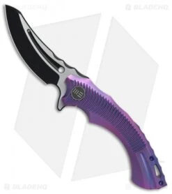 This Sea Monster model has a purple anodized handle and a two-tone black/satin blade.